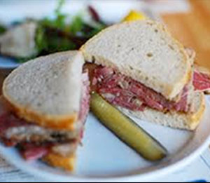 Traditional recipe, organic grass fed beef smoked for 11 days and served on fresh rye with a side of crisp, organic, sweet potato fries and a local pickle
